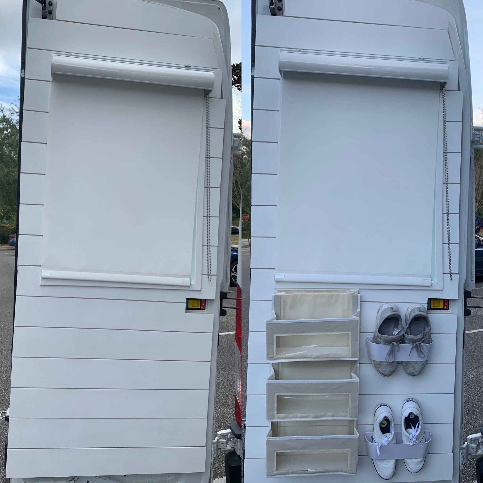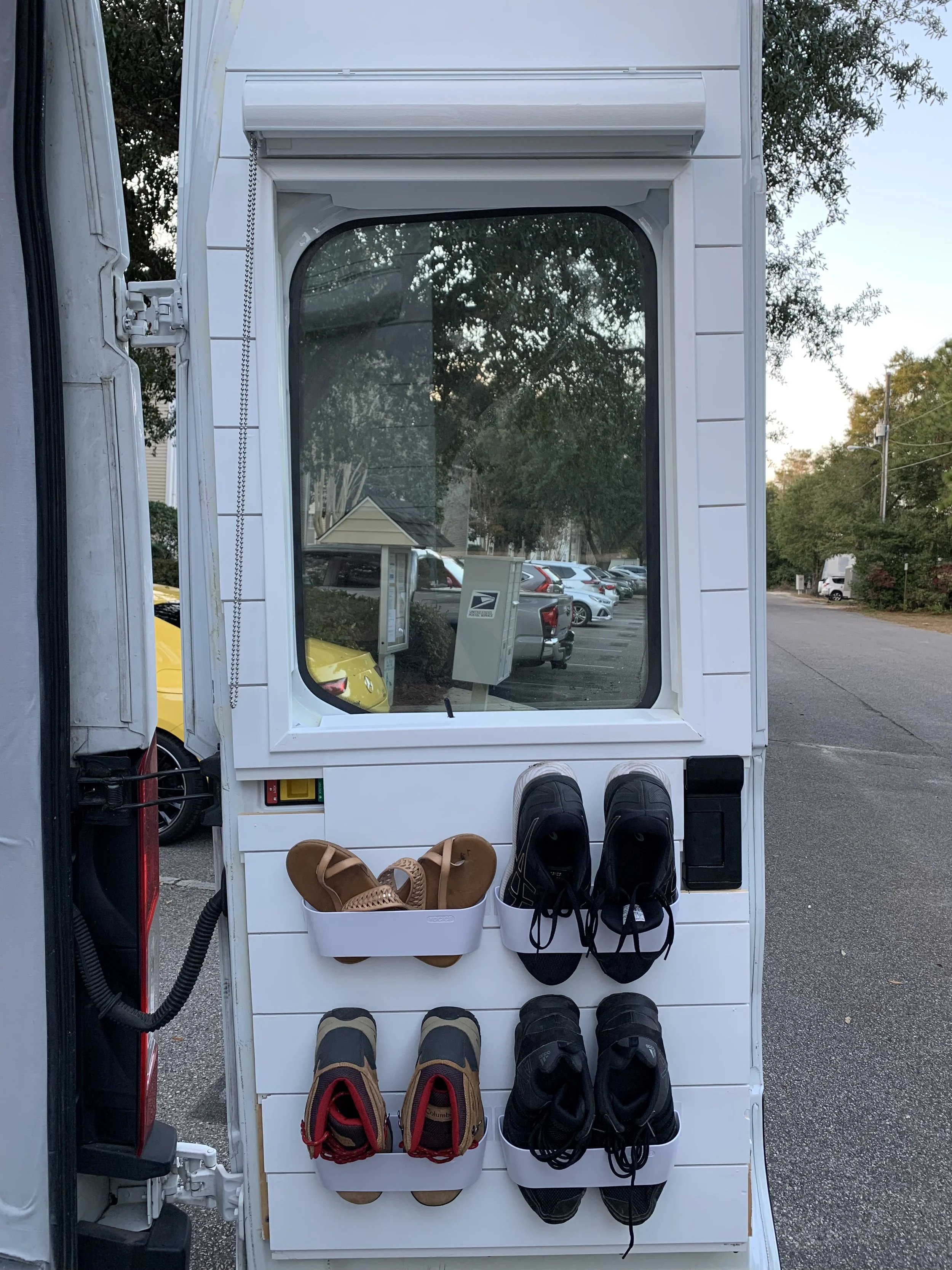 When you live in a tiny place you need to think of anything to maximize every area you can. On our back doors we had a good amount of space that was just wasted space. We had a few different shoes and no where to put them. Having them on the back doors was a great idea that I thought of and I waned to share it. On the other door we have a three compartment storage for random knickknacks and it has come in handy. You don’t know how many things we need to just put our everyday stuff and having different compartments is a must.
