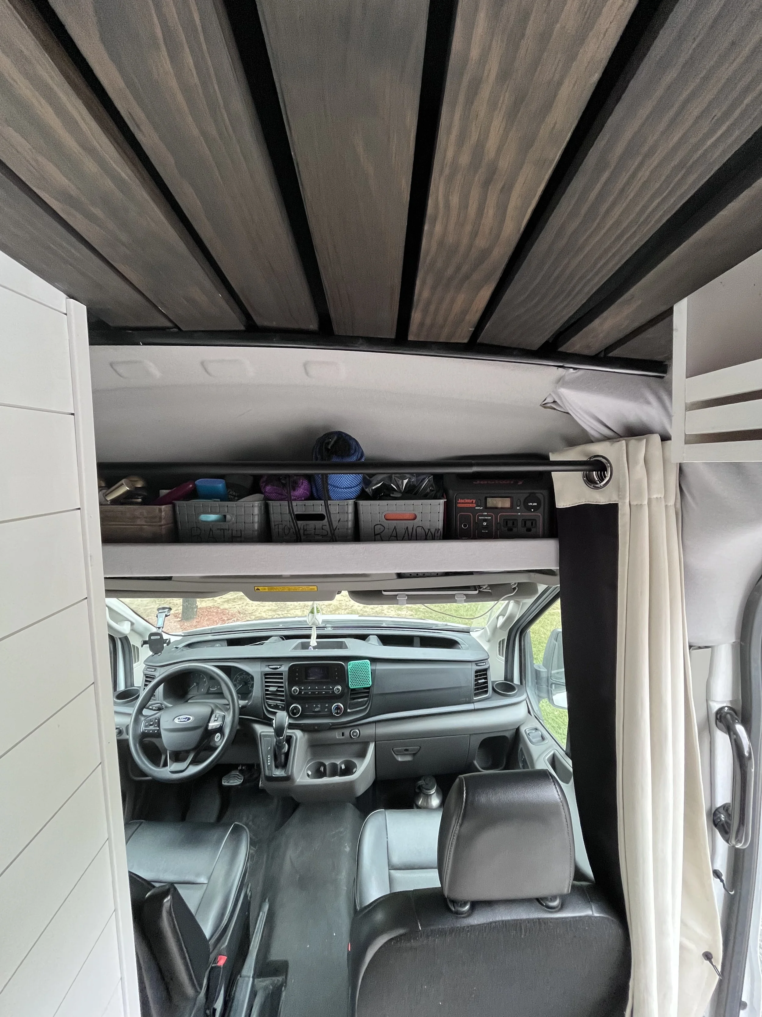 This is key for extra storage In your van. In all of the cargo vans there is this space to put a shelf for storage and you can put all kinds of stuff up here. In ours we have these pins and out toiletries and hair stuff, towels, some hiking stuff and our jackery. The best part about this is you can put whatever you up here. Some people even put doors and make it look just like the rest of the cabinets in their living space.
