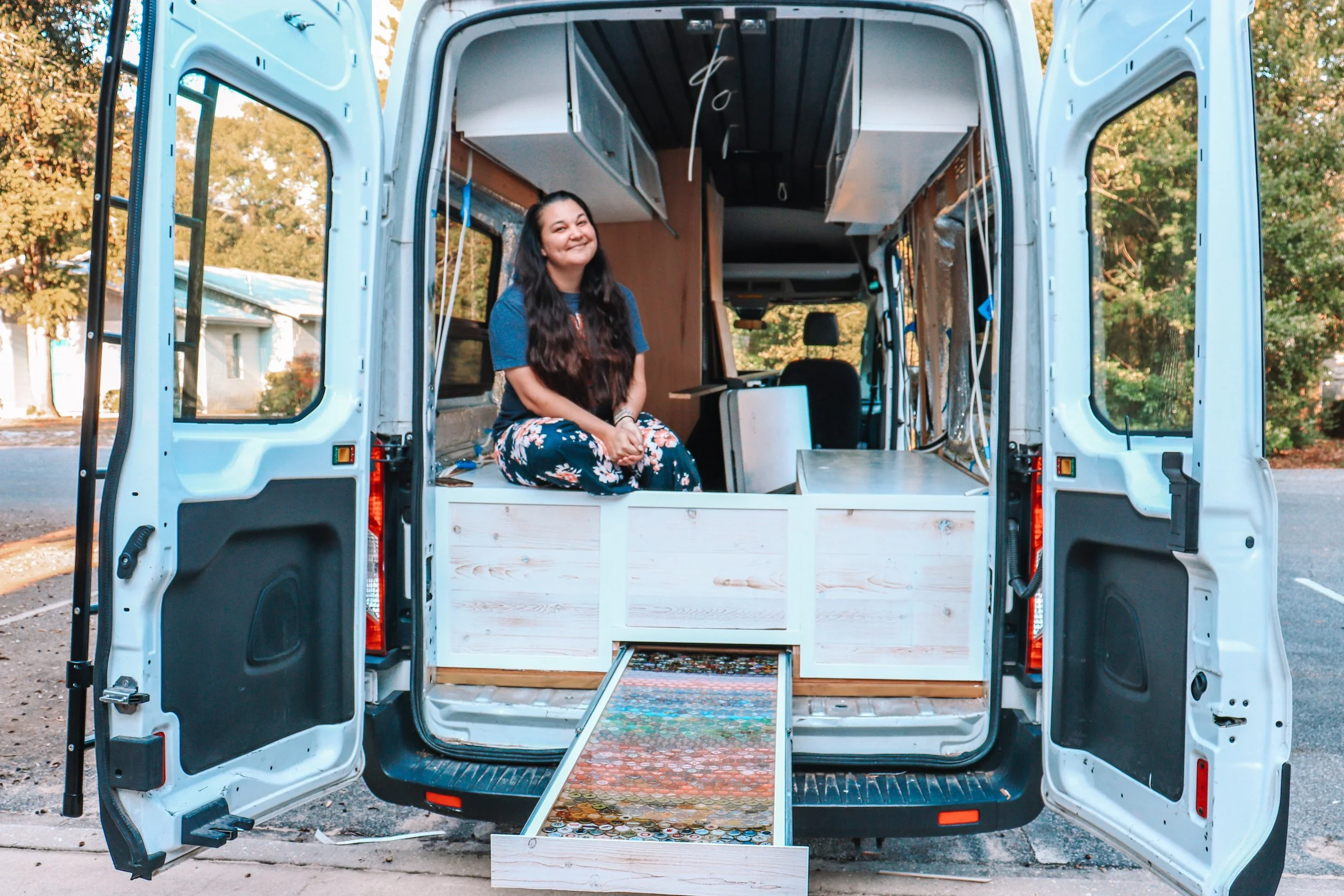 Our van is the Ford Transit extended and it’s about 90 square feet of living space. Our van is not the largest compared to the other vans but with us doing an outdoor table it makes our van larger in terms of living space.