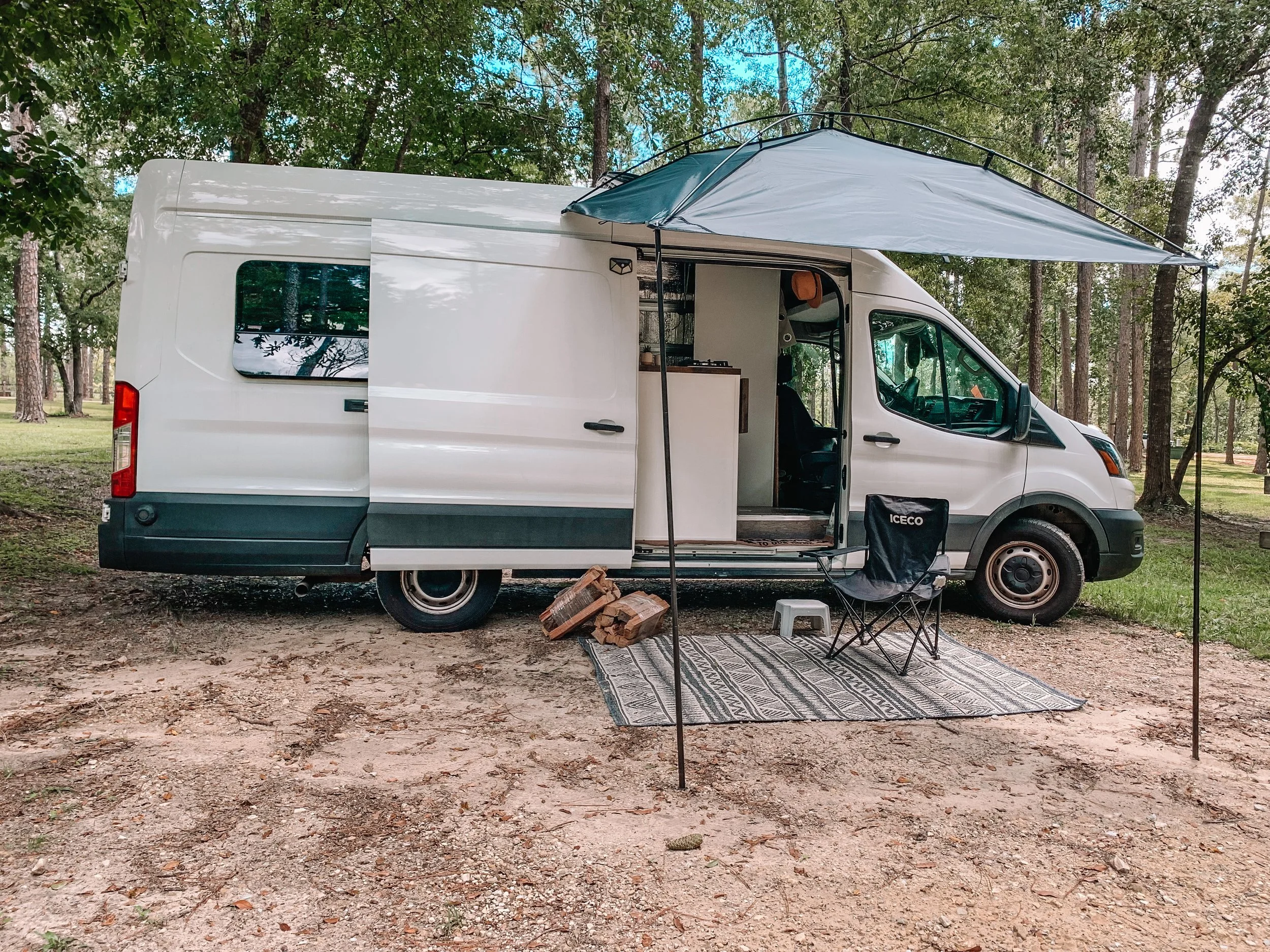 In this photo above you can see that our van is not completed but we still took it out on some trips to test it out and see what needed to be changed or added. This moon shade collapsible awning is the perfect way to make the outside apart of your space. It blocks rain and provides shade and is so perfect for making a nice little porch outside your space.