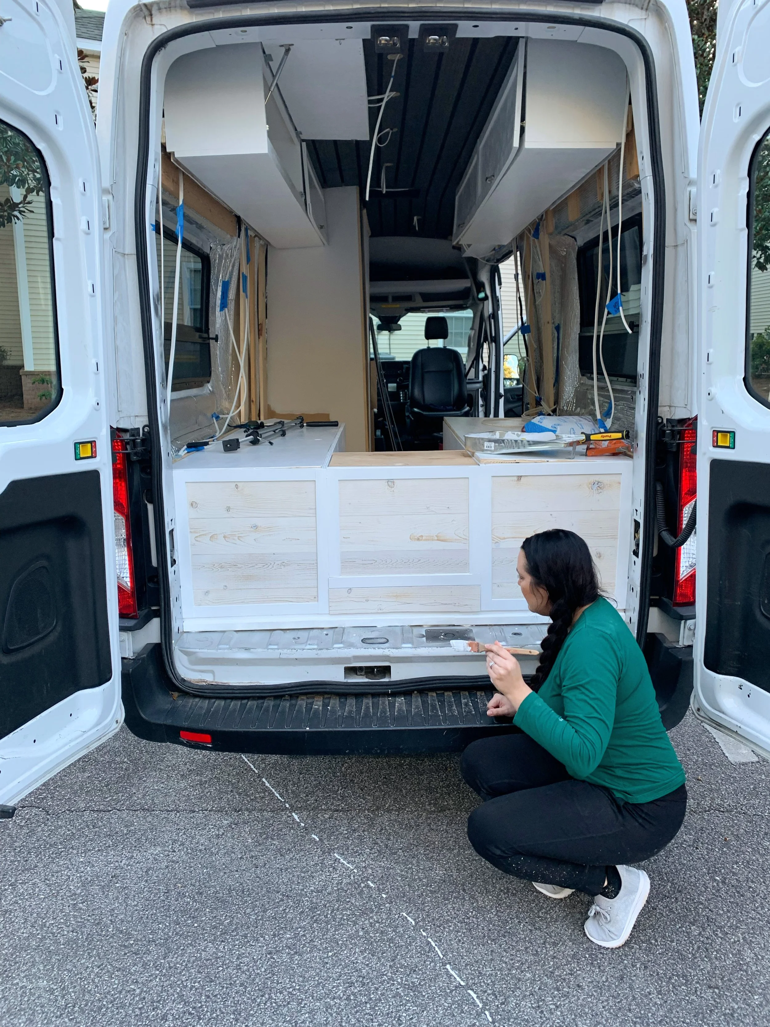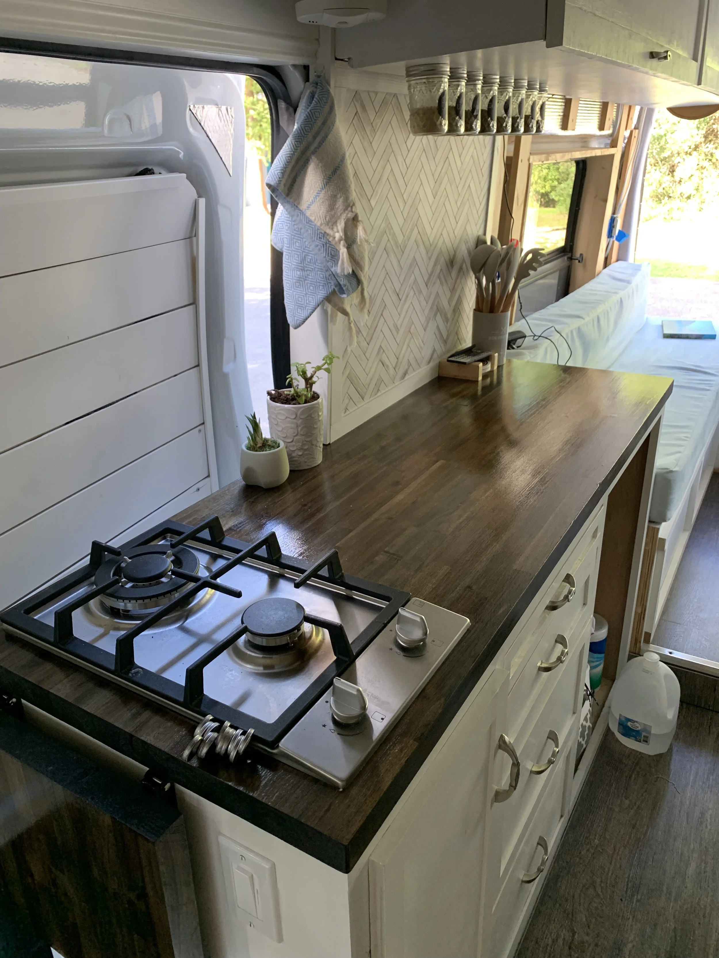 In the photo above you can see our van is not finished yet but this is the point where you have to think of ways to maximize every inch of your rig to hold things that you will need. In the photo you can see we used the empty space under the upper cabinets to hold our spices. We bought some small jars and just screwed the caps to the cabinet so when we take the jar down the cap stays up there. This is a great way we can have our favorite spices and they are out of the way of getting knocked off.