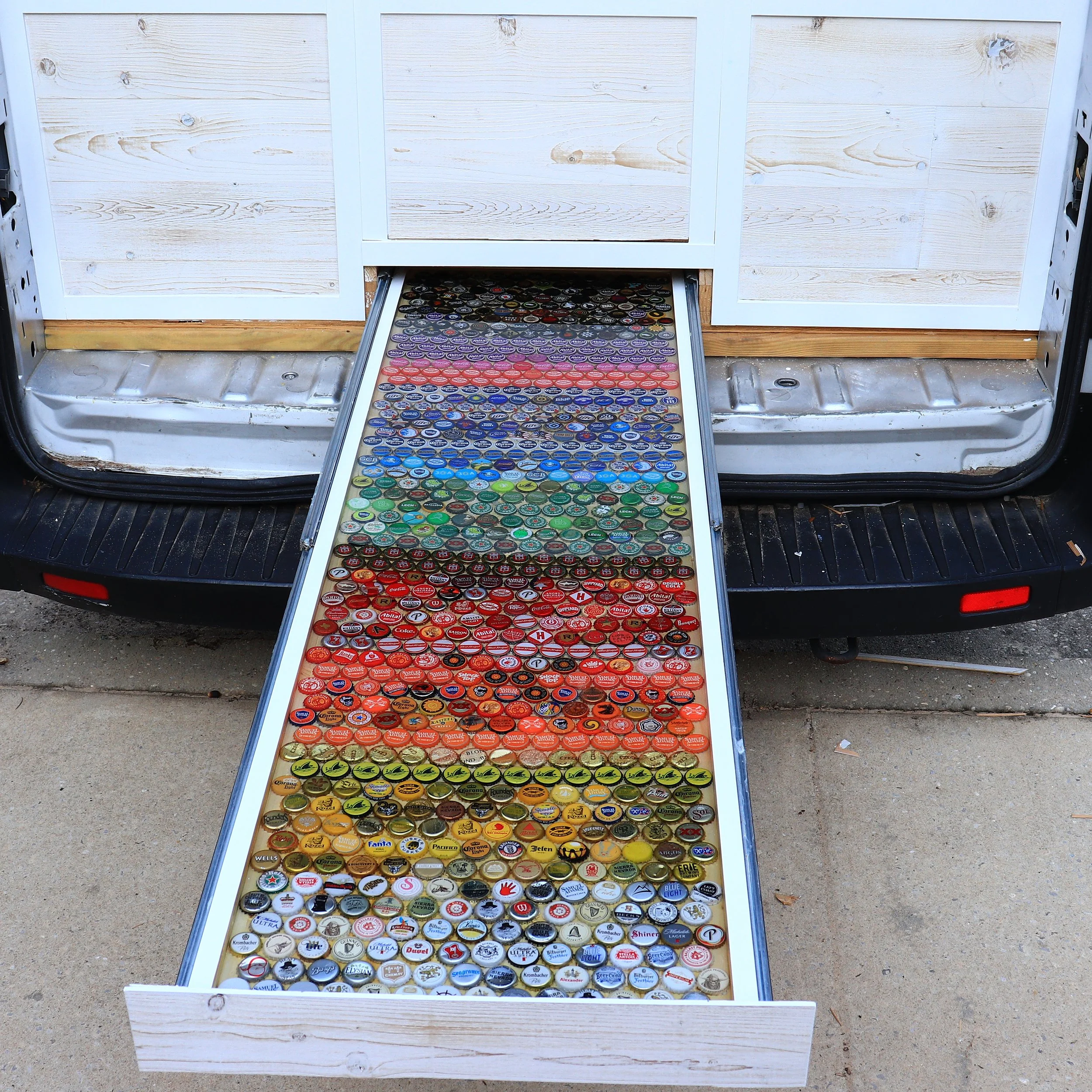As you can see we decided to do all different beer caps simply because my husband is a big beer fan and likes to try all different kinds so we compromised and he got his beer table. When the table is tucked away you can’t tell that there is one and we like that. If your wanted to see the logistics on how we built this and the dementions check out this video. We explained it here.