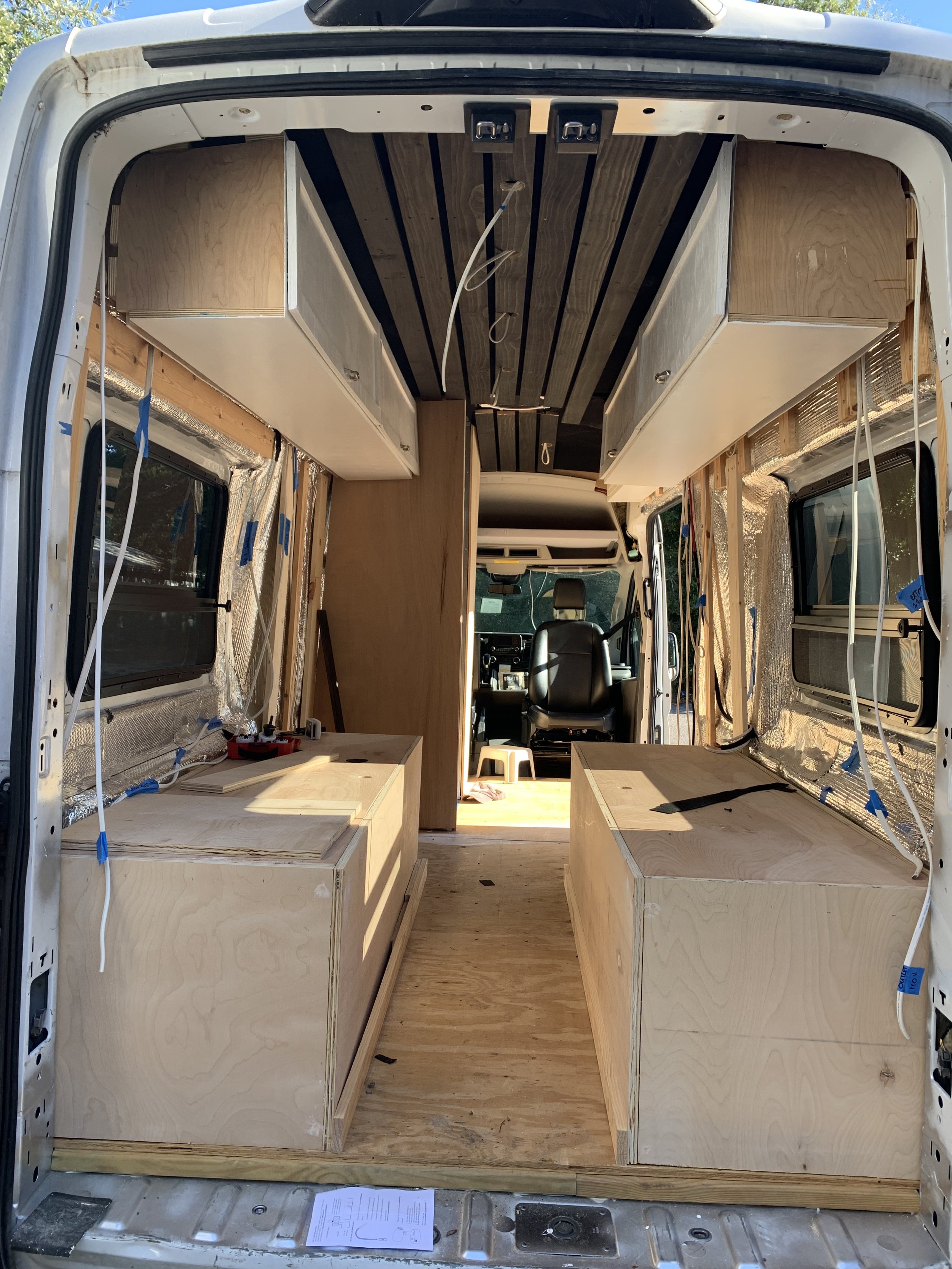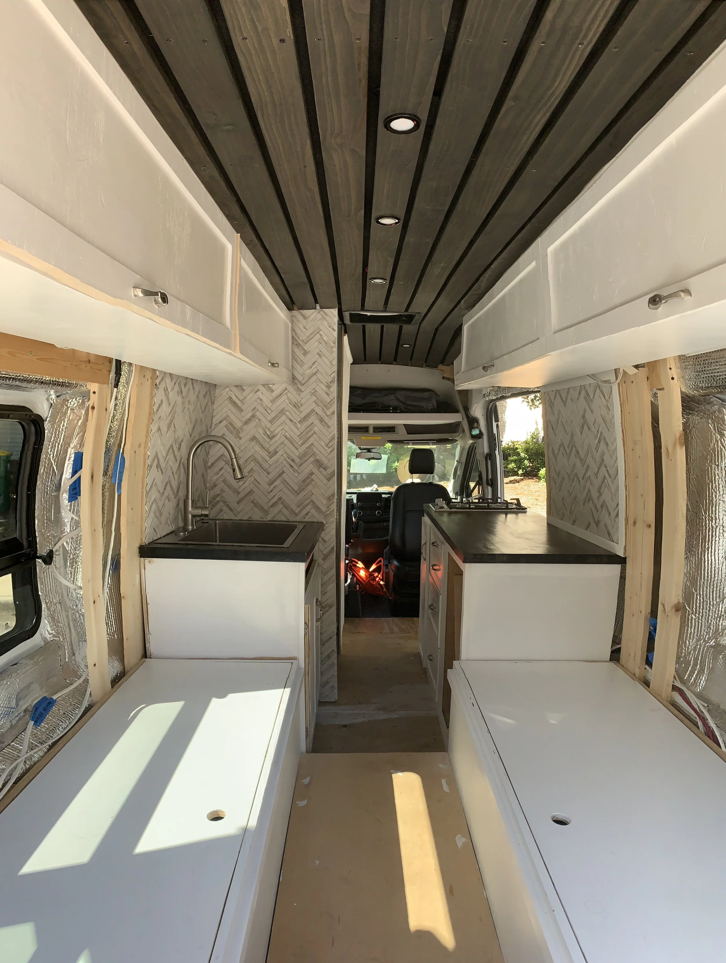 At this point you're almost there. You have some good structural stuff built and almost completely done. Now its time to start thinking about your water and kitchen setup. Thinking about how and where your plumbing will be and run is important and now you have to build the cabinets for the sink and kitchen. In your kitchen are you going to have a propane cooktop or induction or just pull out a Coleman stove every time you cook. Also have to build drawers and find a place your wanting your fridge.