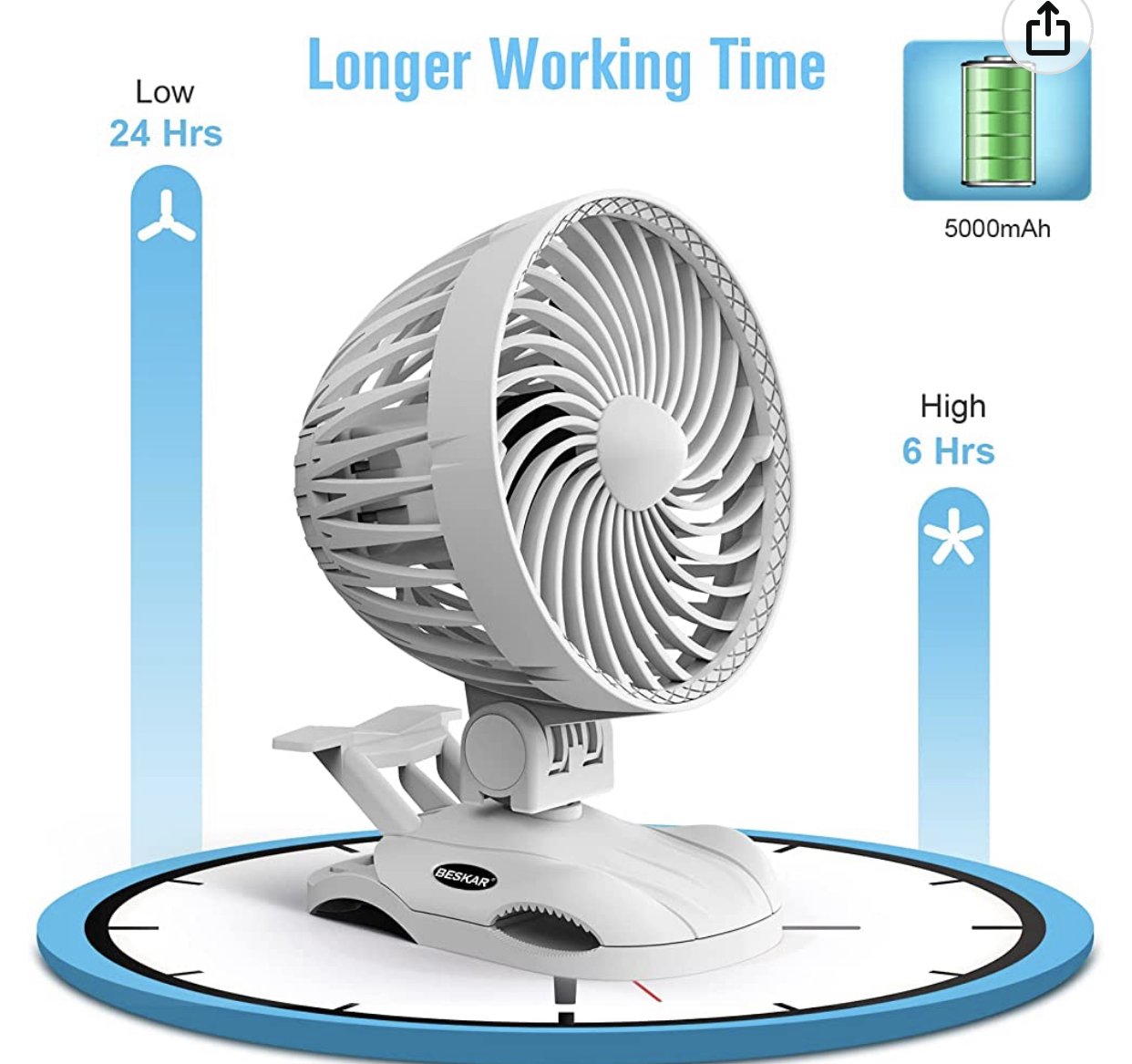 The next thing that’s strongly recommended is portable and rechargeable fans. We have all 3 of these you see below. I know a little extensive but ther’re all for different uses. We use the big one for outside a lot and it’s great because it has a light and a hook on the bottom for hanging. And for the white small ones they are great because we clip them onto our upper cabinets and they act like a ceiling fan.